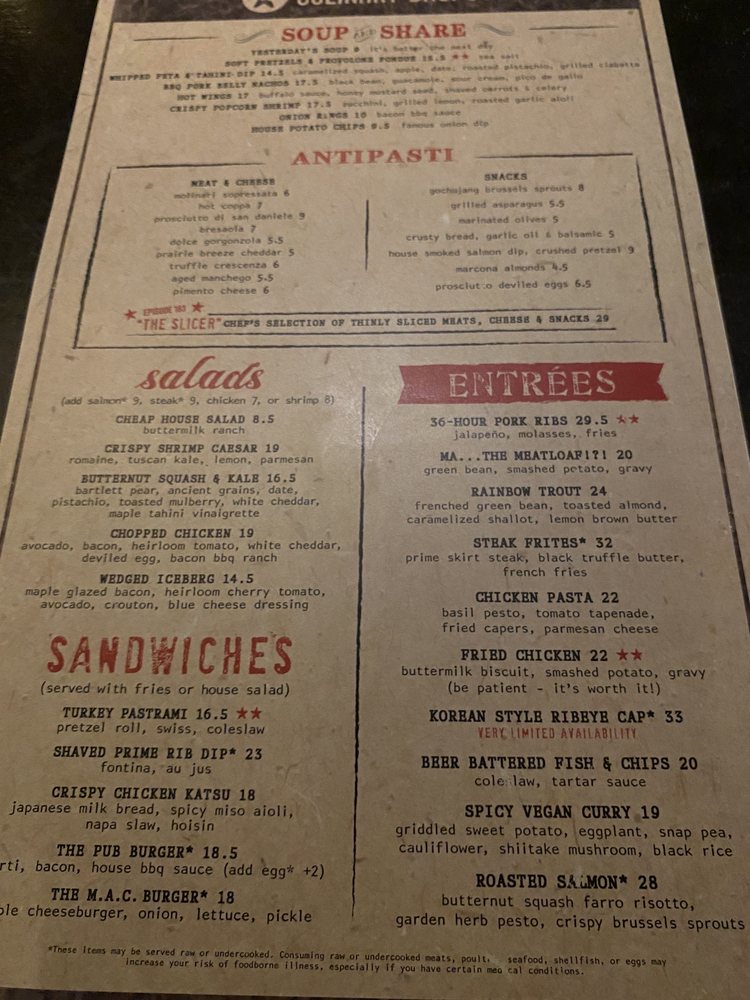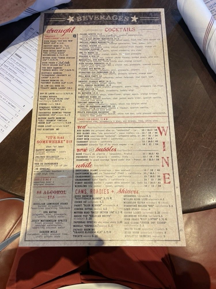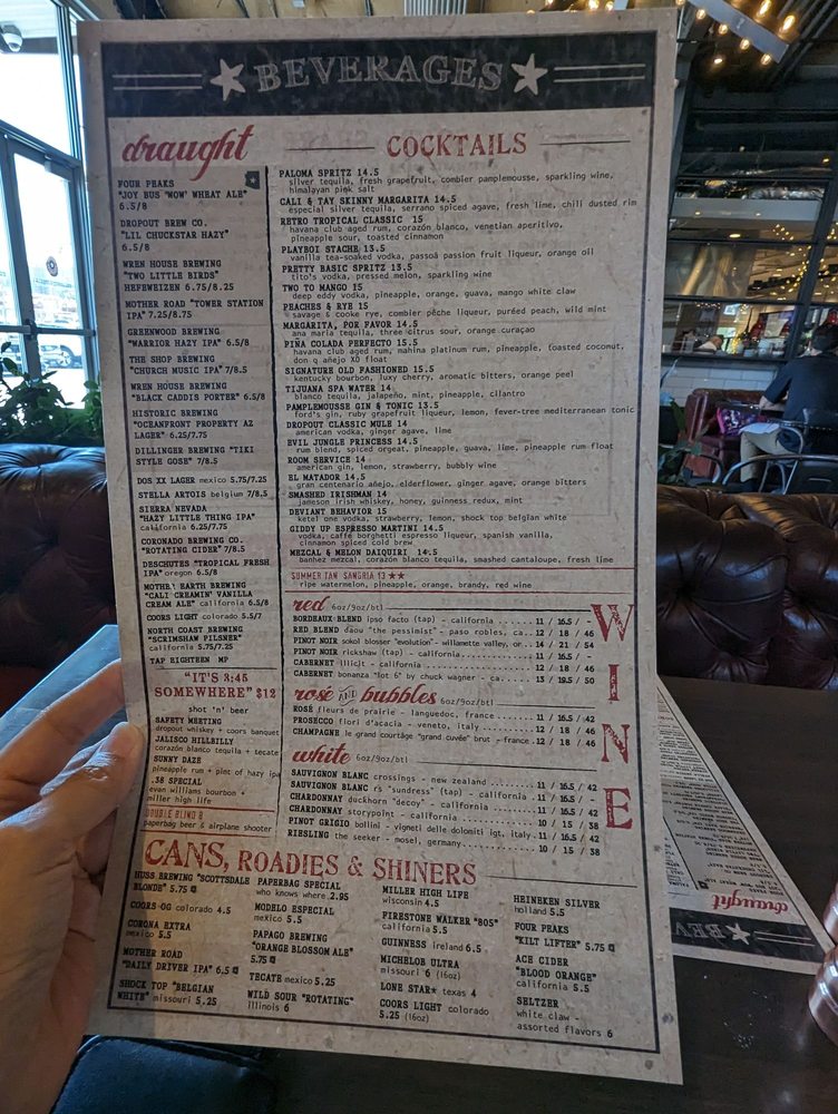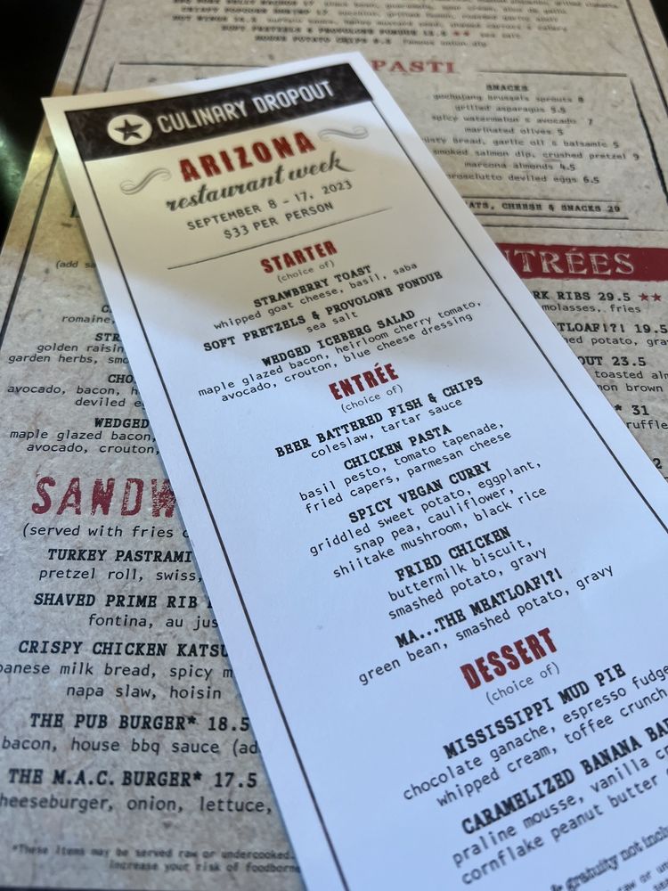 Introducing the menu at Culinary Dropout, a trendy New American restaurant in Tempe, Arizona. This hipster hotspot offers a variety of options including vegan dishes, limited vegetarian choices, and a full bar with gourmet cocktails. The ambiance is a mix of retro elegance and funk, attracting a diverse crowd for lunch, dinner, or happy hour specials. Customers rave about the attentive service from staff like Sydney and Delaney, who contribute to the warm and inviting atmosphere. Must-tries include the shrimp Caesar salad, pretzels with fondue, and the flavorful meatloaf. Whether you're looking for a casual hangout, a date night spot, or a place to gather with friends, Culinary Dropout provides a unique and exceptional dining experience for all occasions. So come for the food, stay for the vibes at Culinary Dropout!